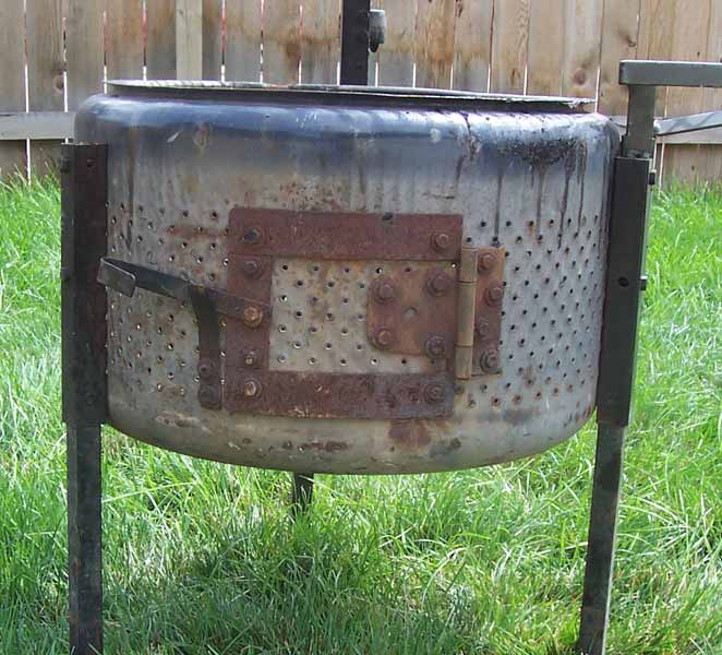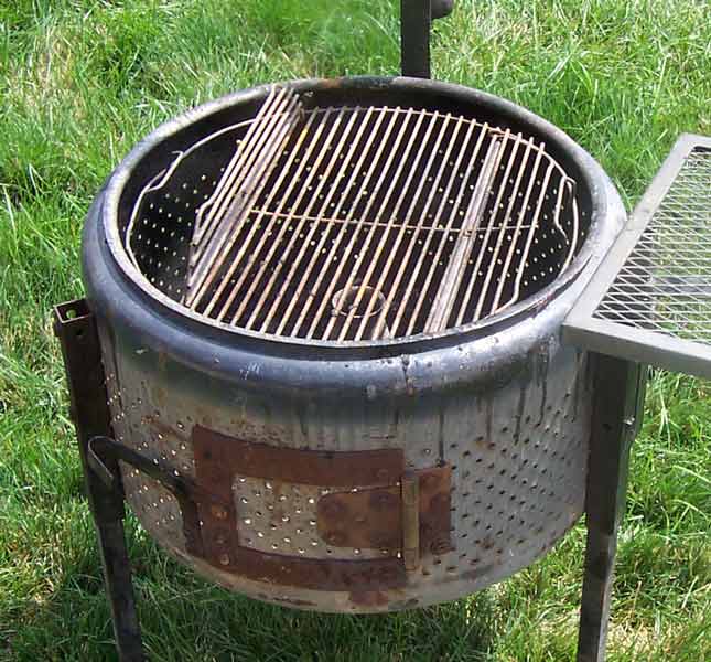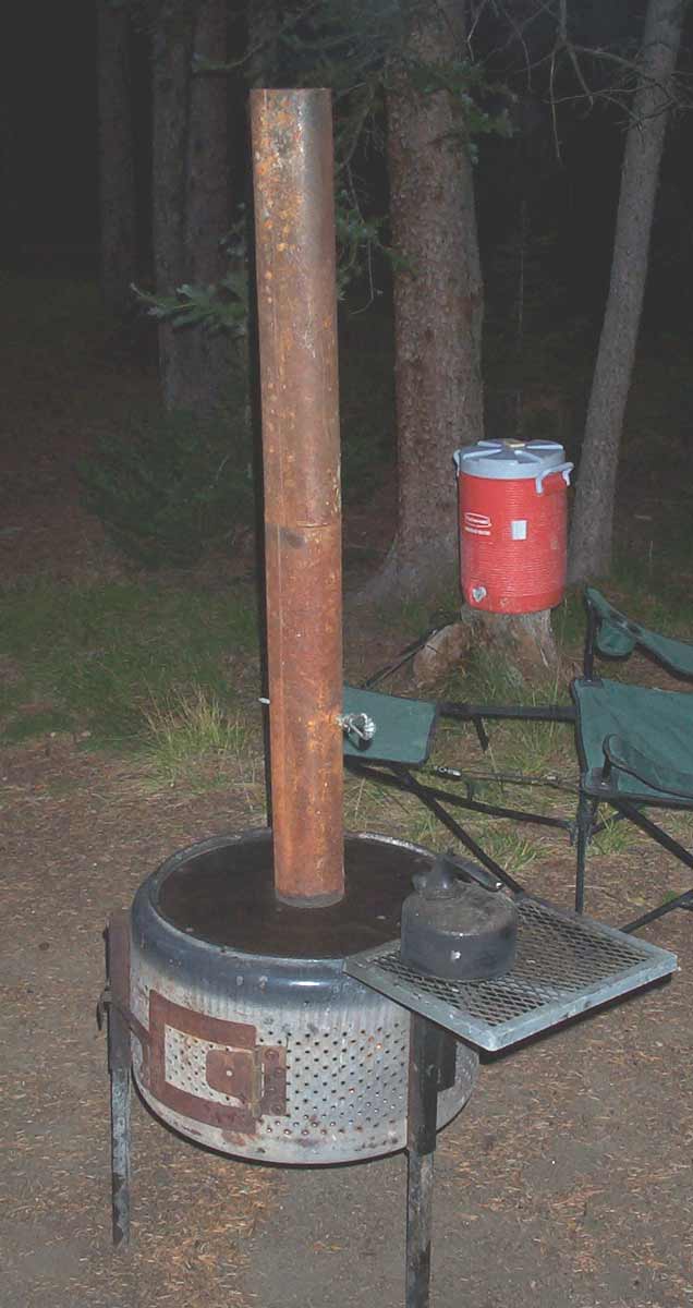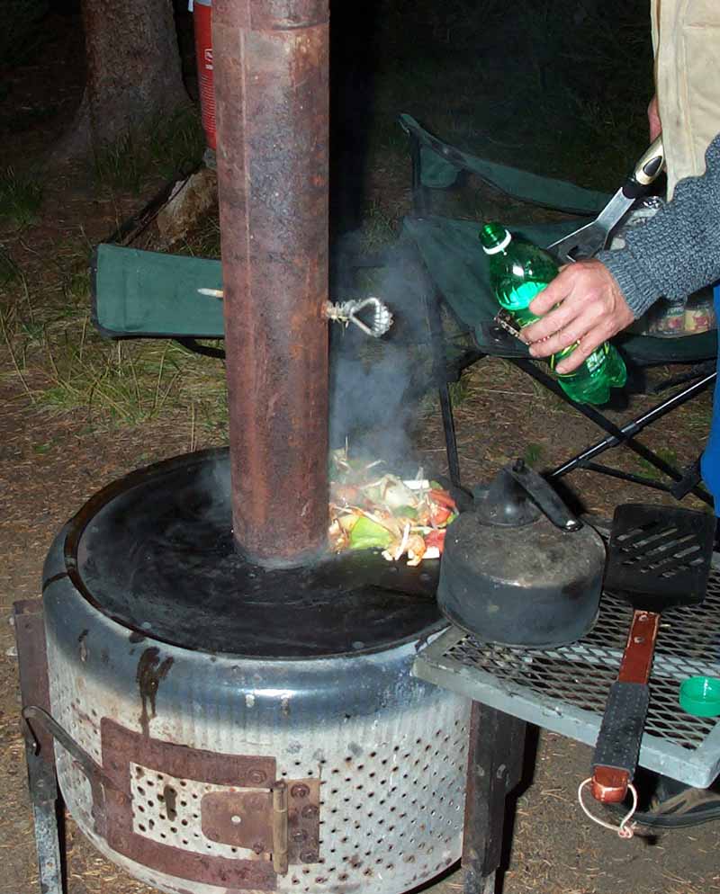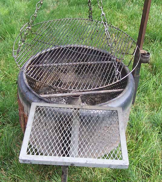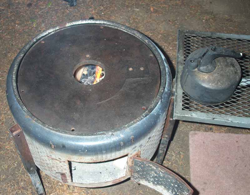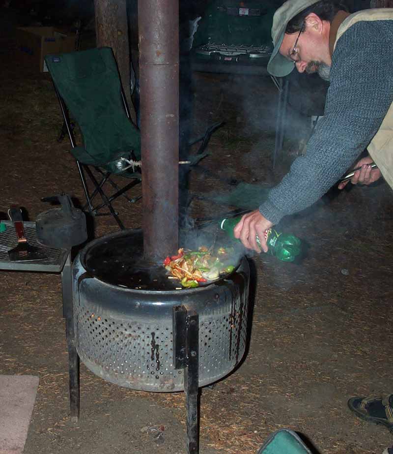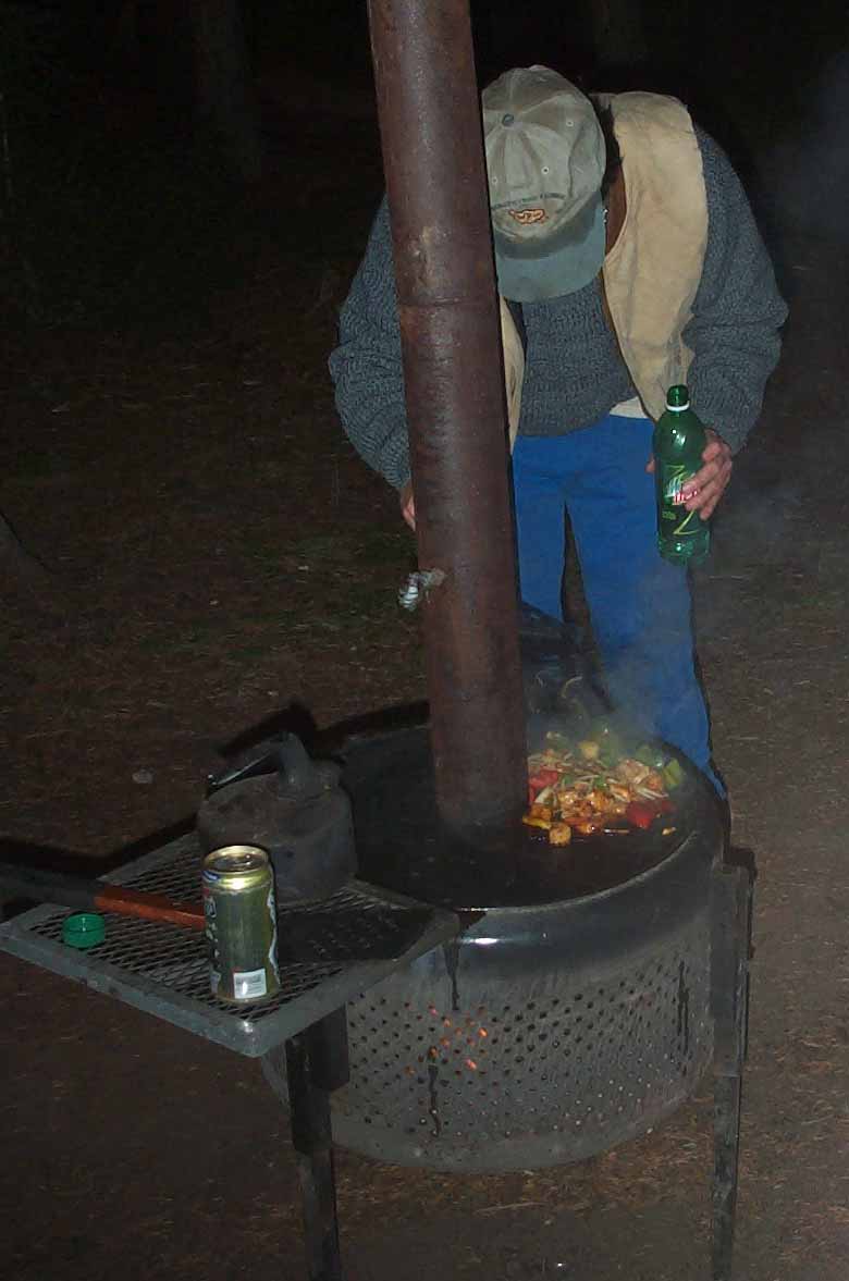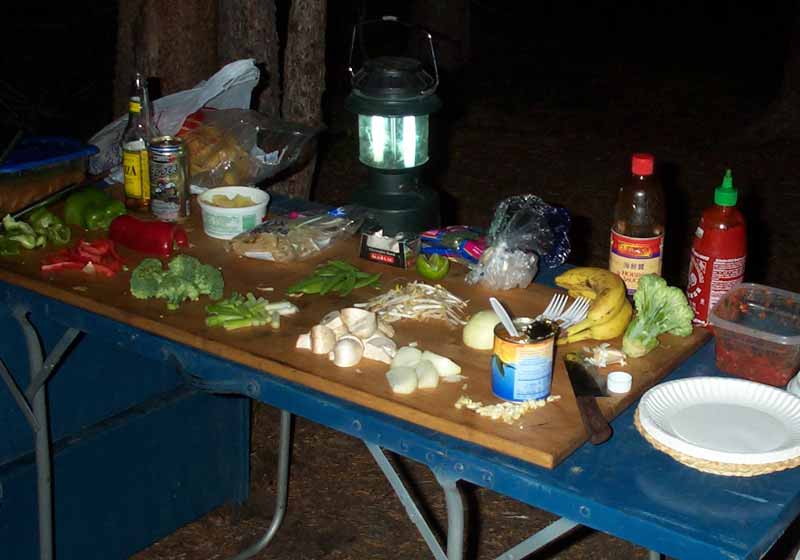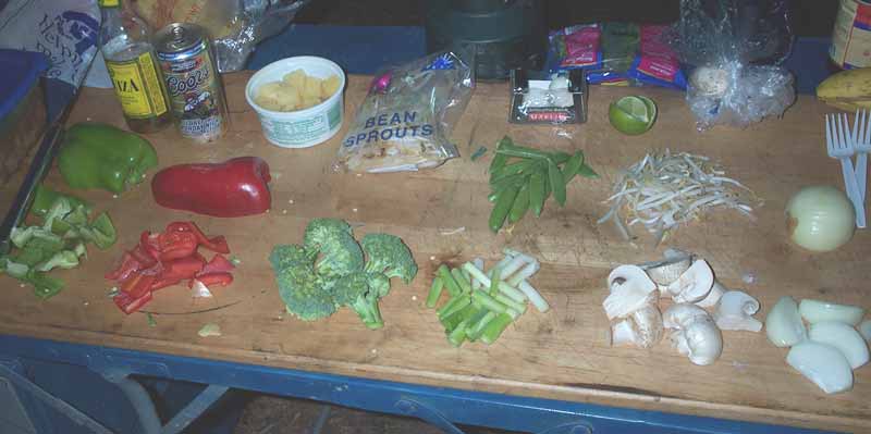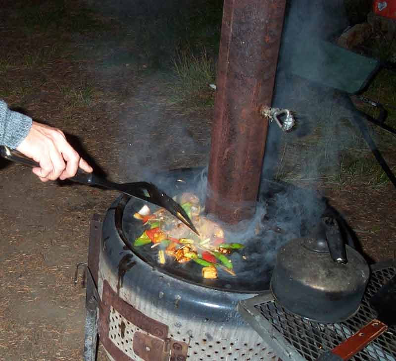 A cast iron plate from a piece of heavy equipment was a perfect fit to make a Mongolian BBQ grill surface. After the surface was ground flat on a flywheel grinder, a four foot chimney with a damper was added. With a good fire the surface temperature on the grill reaches over 500 degrees. Needless to say, food cooks very rapidly! I have found that by moving the food around the chimney, a serving can be cooked in only a few minutes. Adding water each time the food is turned really adds to the flavor and keeps the food from drying out. On average I use about 20 oz of water per serving. Our camping cutting board is about four ft long x 18 inches wide. Works great as each person gets to pick out the ingredients they want for their dish.